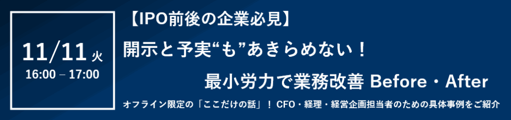 株式会社プロネクサス様、株式会社ナレッジラボ様と共催で「開示と予実“も”あきらめない!最小労力で業務改善Before・After」と題しまして、以下の通りセミナーを開催させていただきます。 ■開催日時2025年11月11日(火)16:00~17:00 ■会場プロネクサス大... -