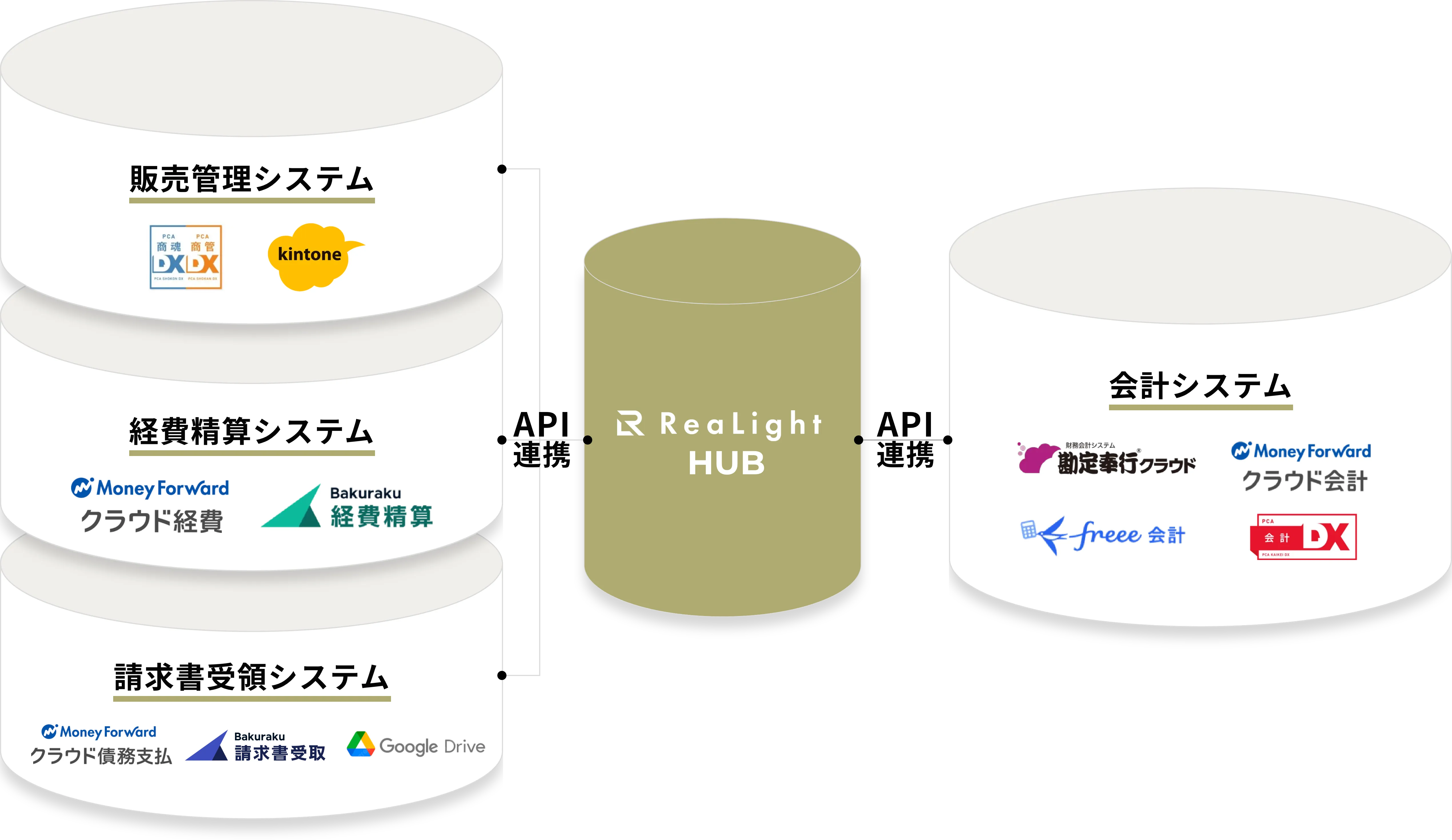 経理システム間のAPI連携を個別開発することで、ReaLightHubを介して様々な経理システムを連携することができます。